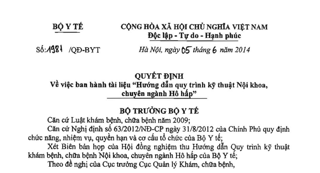 VỀ VIỆC BAN HÀNH TÀI LIỆU “HƯỚNG DẪN QUY TRÌNH KỸ THUẬT NỘI KHOA, CHUYÊN NGÀNH HÔ HẤP”