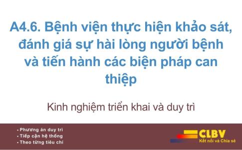 Tiêu chí A4.6 không chỉ yêu cầu bệnh viện “phát phiếu khảo sát”, mà yêu cầu bệnh viện xây dựng được một cơ chế lắng nghe có hệ thống, phân tích có trọng tâm và cải tiến có hành động dựa trên sự hài lòng của người bệnh.