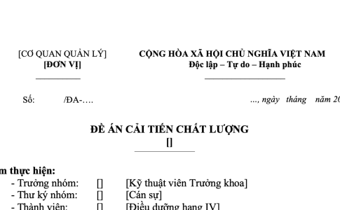 Đây là biểu mẫu “Đề án cải tiến chất lượng” dùng trong bệnh viện để xây dựng và triển khai một hoạt động cải tiến cụ thể theo phương pháp có hệ thống.