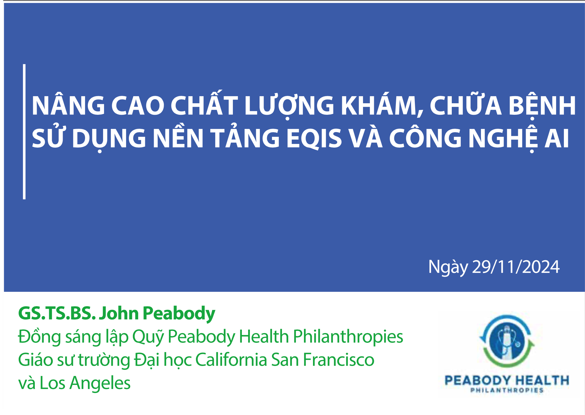 Cải thiện chất lượng chăm sóc sử dụng nền tảng EQIS, kết quả sử dụng công cụ AI tại 7 bệnh viện ở Việt Nam Improving the Quality of Care using the EQUIS platform Results from 7 Hospitals in Vietnam - Dr. John Peabody, MD, PhD Professor UCSF and UCLA Peabody Health Philanthropies, USA