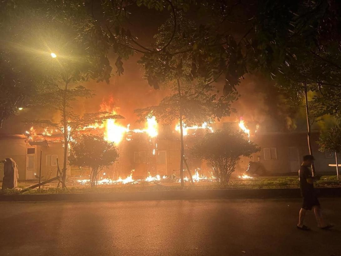 Hà Nội - Kho vật tư và nhà ăn rộng hơn 100 m2 của Bệnh viện Đức Giang ở quận Long Biên bốc cháy khoảng một tiếng, tối 10/10.