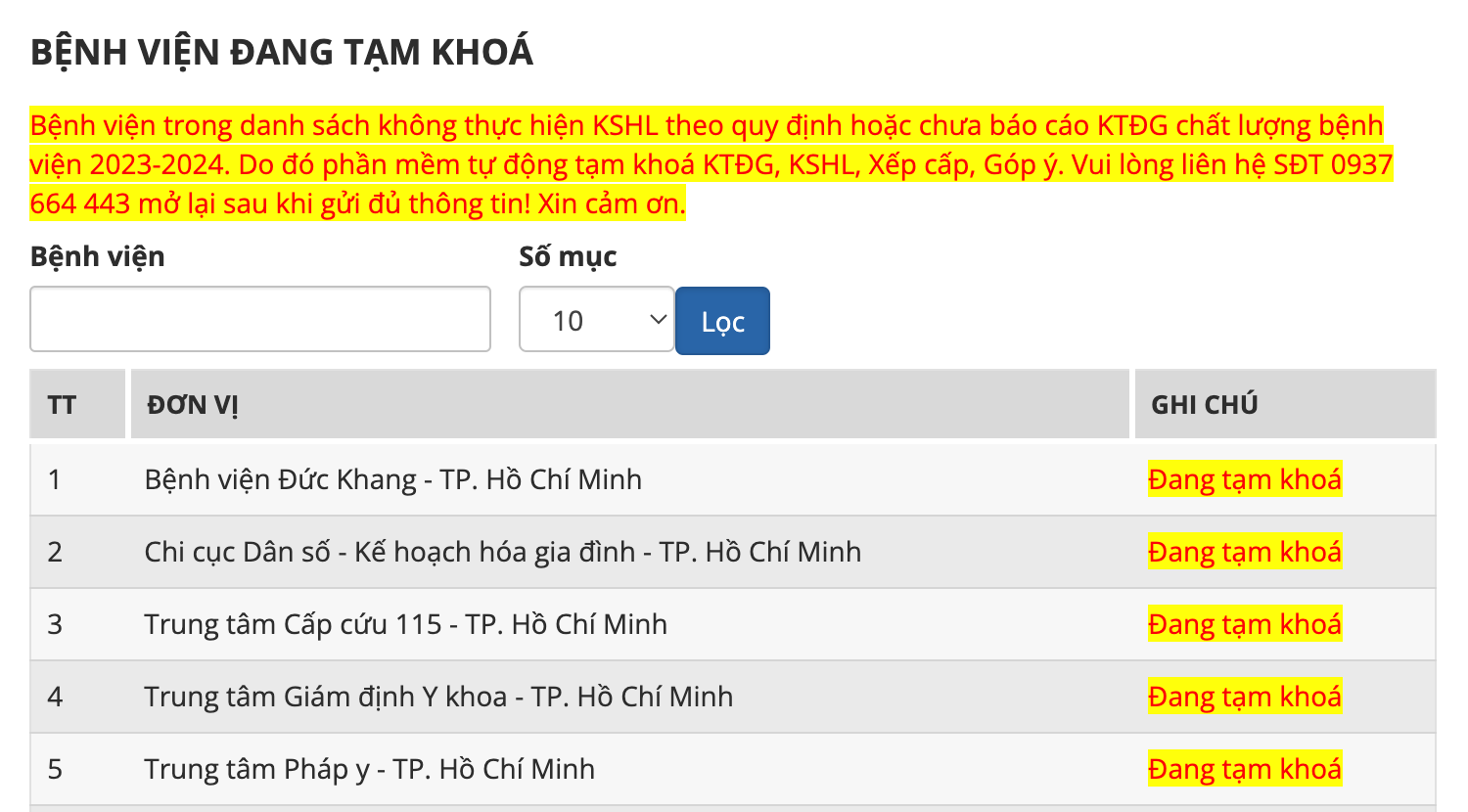 Tạm khoá Tài khoản bệnh viện trên trang chatluongbenhvien.vn