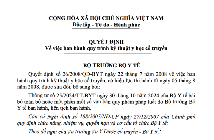Quyết định số 26/2008/QĐ-BYT ngày 22 tháng 7 năm 2008 về việc ban hành quy trình kỹ thuật y học cổ truyền, có hiệu lực thi hành từ ngày 05 tháng 8 năm 2008, được sửa đổi, bổ sung bởi:
