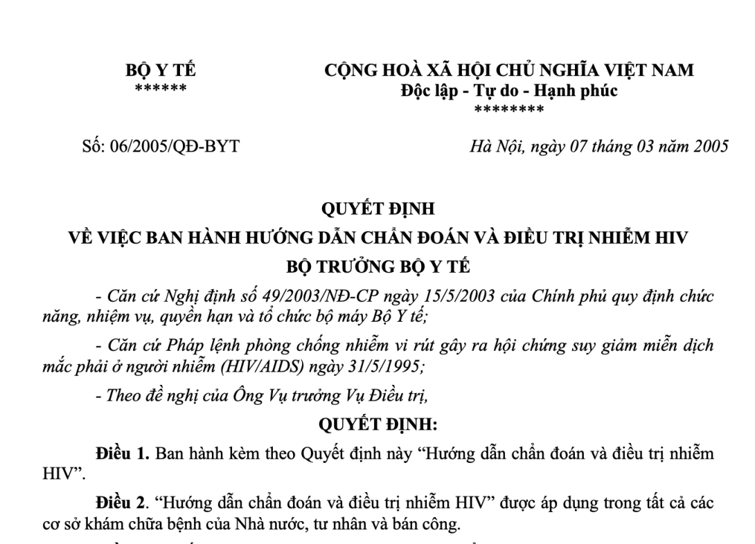 Điều 1. Ban hành kèm theo Quyết định này “Hướng dẫn chẩn đoán và điều trị nhiễm HIV”.