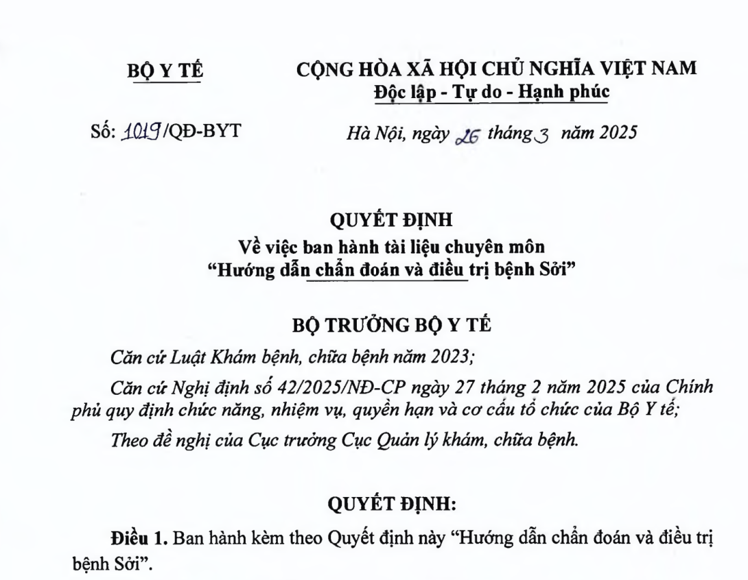 Quyết định 1019/QĐ-BYT ngày 26/03/2025 về Tài liệu chuyên môn “Hướng dẫn chẩn đoán và điều trị bệnh Sởi” do Bộ trưởng Bộ Y tế ban hành