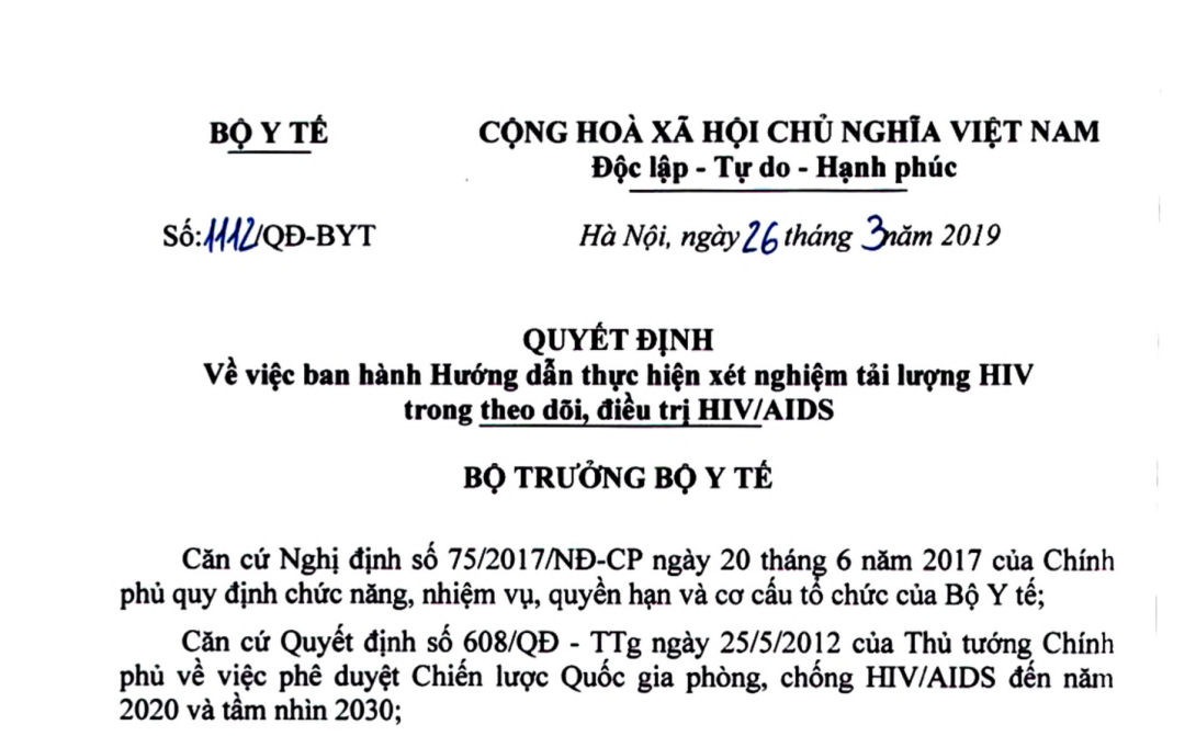 VỀ VIỆC BAN HÀNH HƯỚNG DẪN THỰC HIỆN XÉT NGHIỆM TẢI LƯỢNG HIV TRONG THEO DÕI, ĐIỀU TRỊ HIV/AIDS