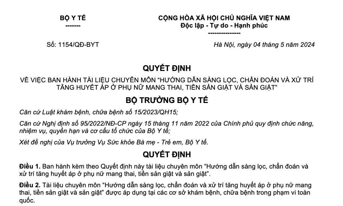 VỀ VIỆC BAN HÀNH TÀI LIỆU CHUYÊN MÔN “HƯỚNG DẪN SÀNG LỌC, CHẨN ĐOÁN VÀ XỬ TRÍ TĂNG HUYẾT ÁP Ở PHỤ NỮ MANG THAI, TIỀN SẢN GIẬT VÀ SẢN GIẬT”