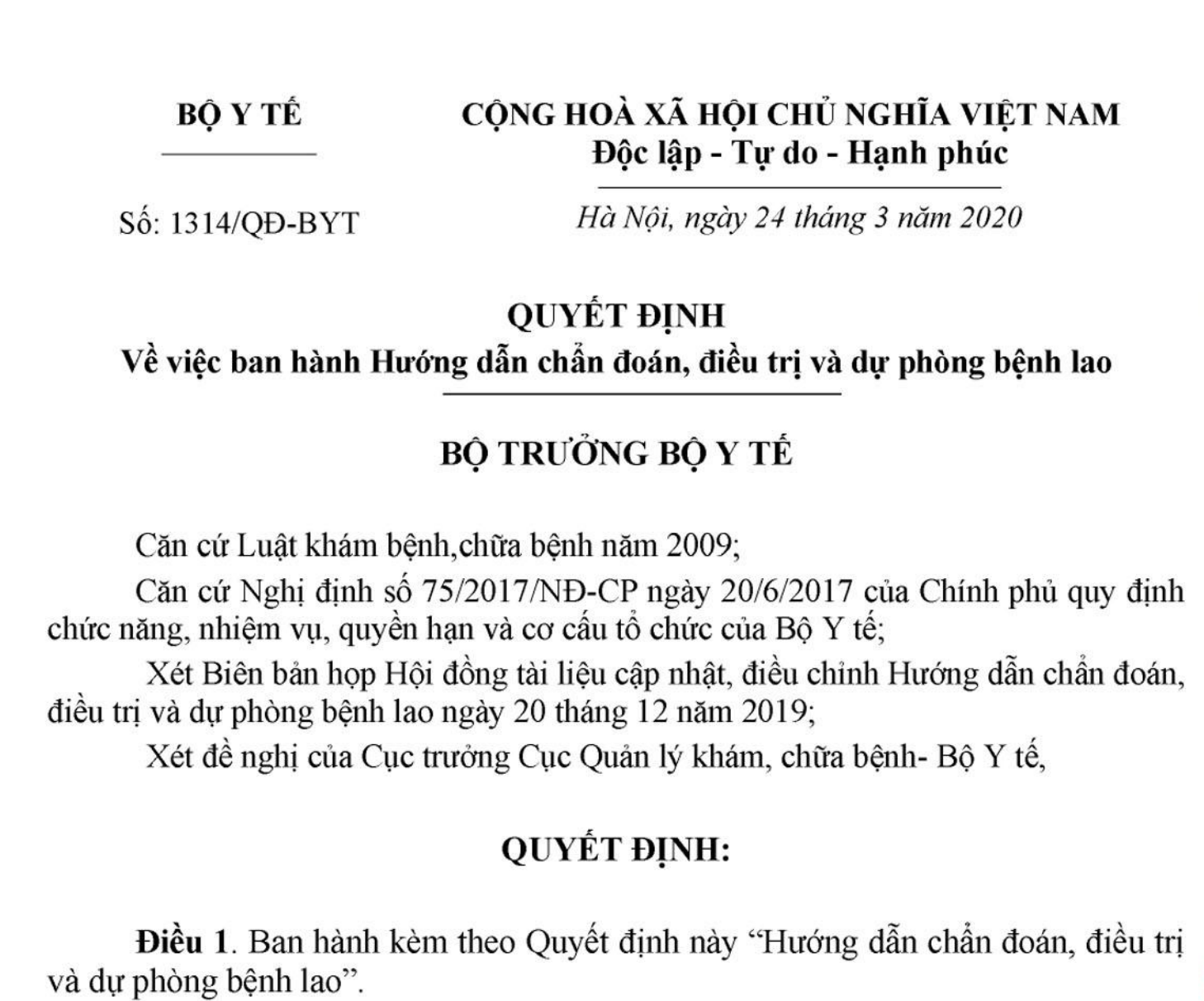 Quyết định 1314/QĐ-BYT ngày 24/03/2020 hướng dẫn chẩn đoán, điều trị và dự phòng bệnh lao do Bộ Y tế ban hành