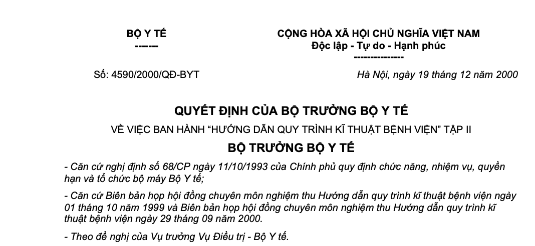 - Căn cứ biên bản họp Hội đồng chuyên môn nghiệm thu "Hướng dẫn quy trình Kỹ thuật Bệnh viện tập 1" ngày 10/01/1999.