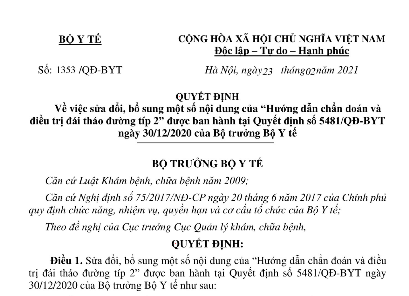 VỀ VIỆC SỬA ĐỔI, BỔ SUNG MỘT SỐ NỘI DUNG CỦA “HƯỚNG DẪN CHẨN ĐOÁN VÀ ĐIỀU TRỊ ĐÁI THÁO ĐƯỜNG TÍP 2” ĐƯỢC BAN HÀNH TẠI QUYẾT ĐỊNH SỐ 5481/QĐ-BYT NGÀY 30/12/2020 CỦA BỘ TRƯỞNG BỘ Y TẾ