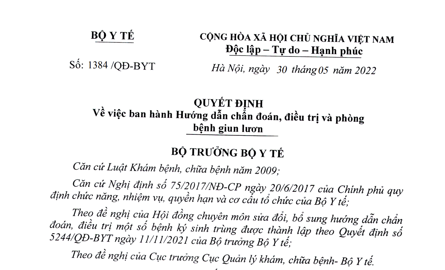 Theo đề nghị của Hội đồng chuyên môn sửa đổi, bổ sung hướng dẫn chẩn đoán, điều trị một số bệnh ký sinh trùng được thành lập theo Quyết định số 5244/QĐ-BYT ngày 11/11/2021 của Bộ trưởng Bộ Y tế;
