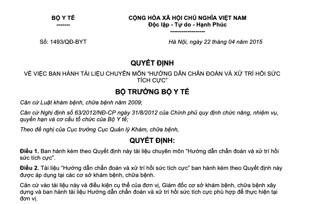 VỀ VIỆC BAN HÀNH TÀI LIỆU CHUYÊN MÔN “HƯỚNG DẪN CHẨN ĐOÁN VÀ XỬ TRÍ HỒI SỨC TÍCH CỰC”