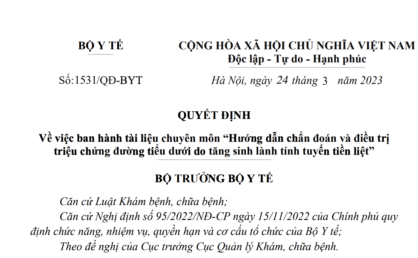 VỀ VIỆC BAN HÀNH TÀI LIỆU CHUYÊN MÔN “HƯỚNG DẪN CHẨN ĐOÁN VÀ ĐIỀU TRỊ TRIỆU CHỨNG ĐƯỜNG TIỂU DƯỚI DO TĂNG SINH LÀNH TÍNH TUYẾN TIỀN LIỆT”