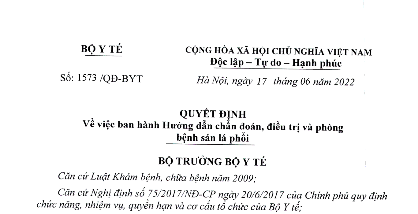 Quyết định 1573/QĐ-BYT năm 2022 hướng dẫn chẩn đoán, điều trị và phòng bệnh sán lá phổi do Bộ trưởng Bộ Y tế ban hành