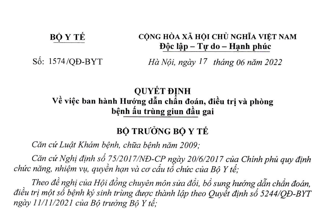 Theo đề nghị của Hội đồng chuyên môn sửa đổi, bổ sung hướng dẫn chẩn đoán, điều trị một số bệnh ký sinh trùng được thành lập theo Quyết định số 5244/QĐ-BYT ngày 11/11/2021 của Bộ trưởng Bộ Y tế;