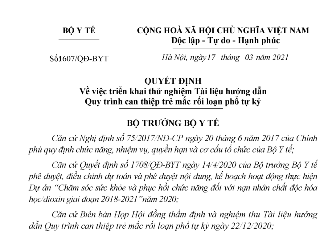 Căn cứ Biên bản Họp Hội đồng thẩm định và nghiệm thu Tài liệu hướng dẫn Quy trình can thiệp trẻ mắc rối loạn phổ tự kỷ ngày 22/12/2020;