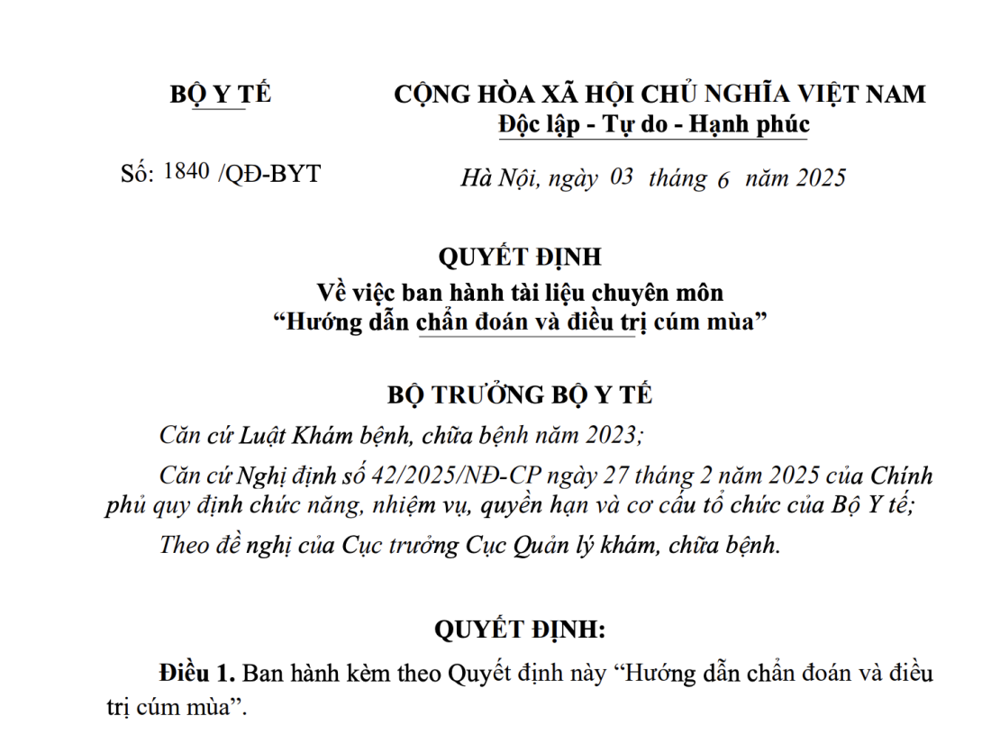 Điều 1. Ban hành kèm theo Quyết định này “Hướng dẫn chẩn đoán và điều trị cúm mùa”.