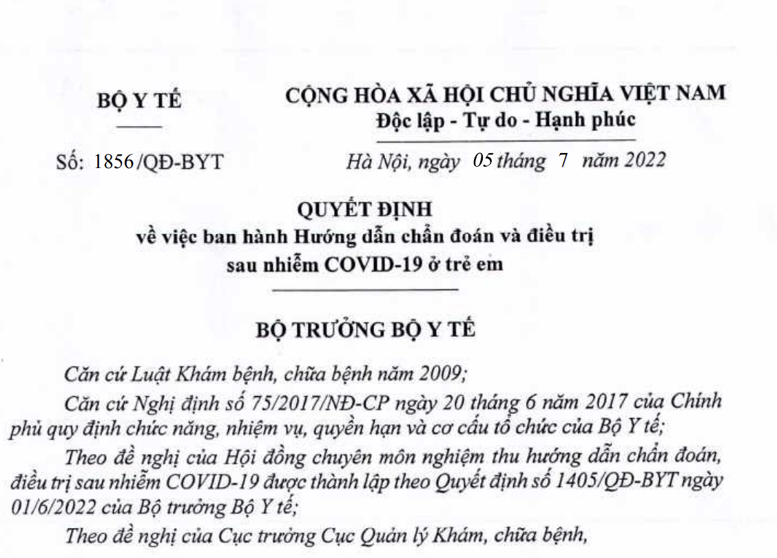 Quyết định 1856/QĐ-BYT năm 2022 hướng dẫn chẩn đoán và điều trị sau nhiễm COVID-19 ở trẻ em do Bộ trưởng Bộ Y tế ban hành