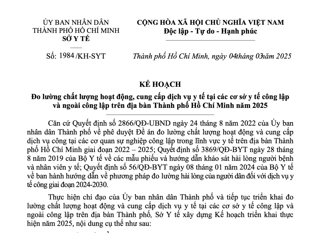 Trên đây là Kế hoạch đo lường chất lượng hoạt động và cung cấp dịch vụ y tế tại các cơ sở y tế công lập và ngoài công lập trên địa bàn Thành phố Hồ Chí Minh năm 2025. Sở Y tế đề nghị các tổ chức, cá nhân có liên quan nghiêm túc triển khai thực hiện. Kết quả triển khai nội dung trên là một trong những tiêu chí đánh giá hoàn thành nhiệm vụ của các đơn vị trong năm 2025.