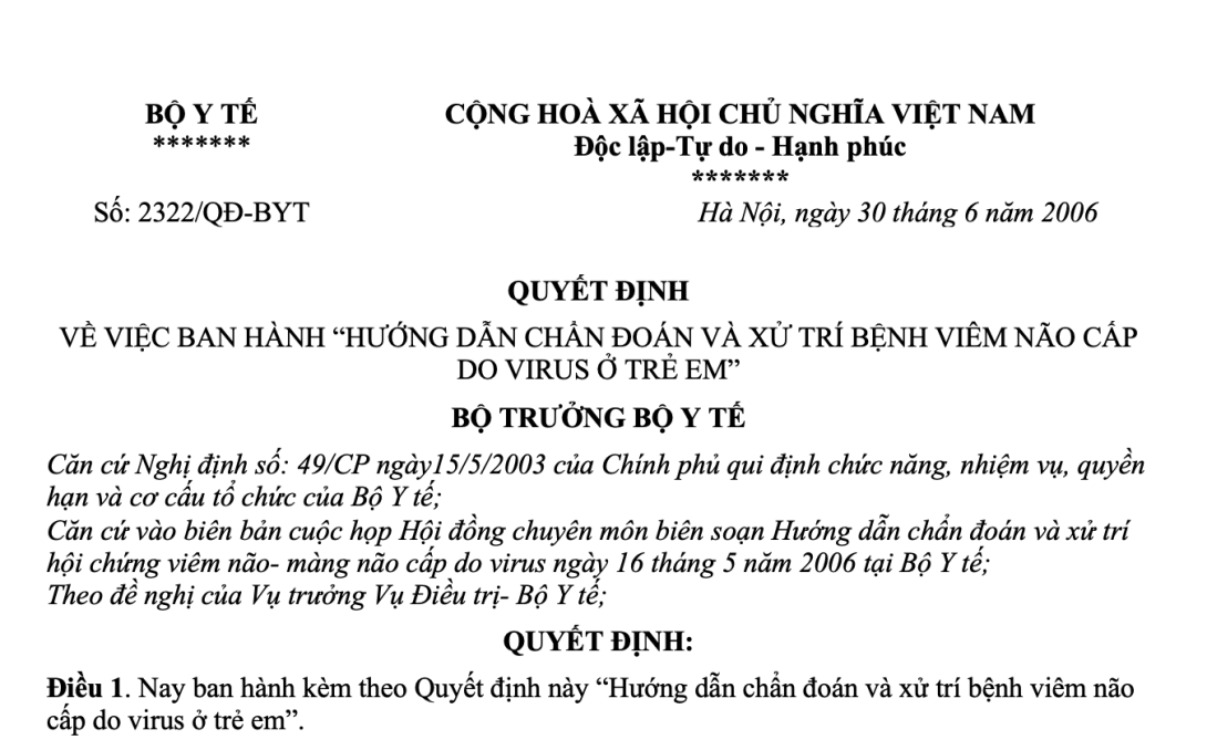 Điều 2. “Hướng dẫn chẩn đoán và xử trí bệnh viêm não cấp do virus ở trẻ em” là tài liệu hướng dẫn được áp dụng trong tất cả các cơ sở khám, chữa bệnh của Nhà Nước và tư nhân.