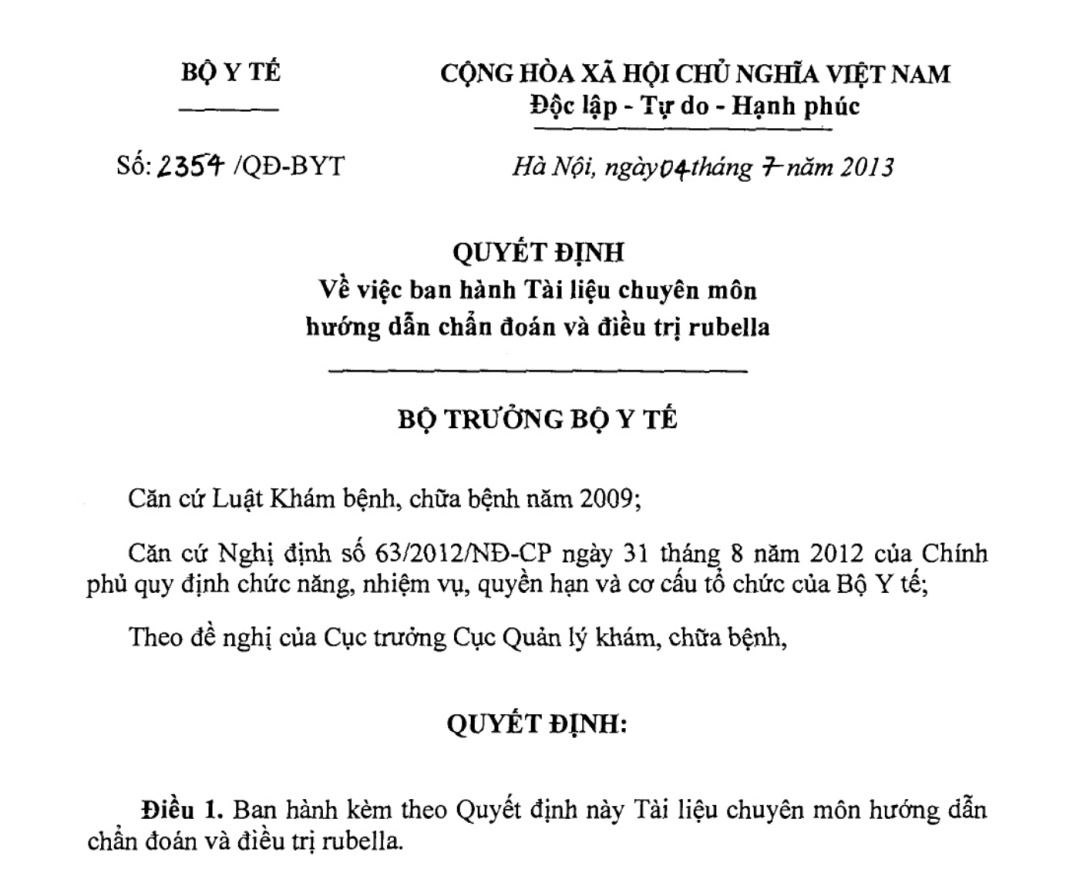 Quyết định 2354/QĐ-BYT ngày 04/07/2013 về Tài liệu chuyên môn hướng dẫn chẩn đoán và điều trị rubella do Bộ trưởng Bộ Y tế ban hành