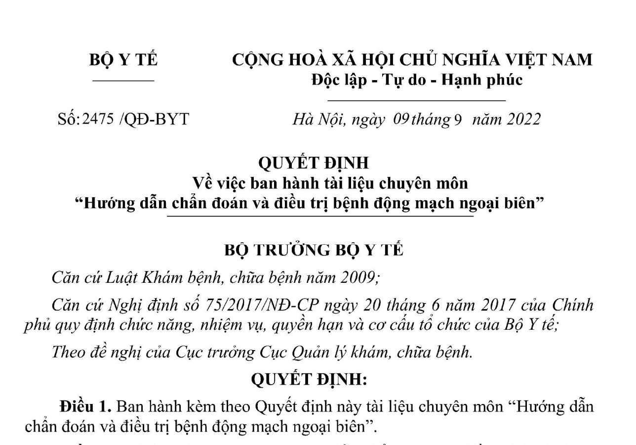 VỀ VIỆC BAN HÀNH TÀI LIỆU CHUYÊN MÔN “HƯỚNG DẪN CHẨN ĐOÁN VÀ ĐIỀU TRỊ BỆNH ĐỘNG MẠCH NGOẠI BIÊN”