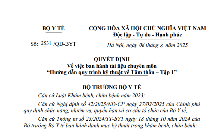 VỀ VIỆC BAN HÀNH TÀI LIỆU CHUYÊN MÔN “HƯỚNG DẪN QUY TRÌNH KỸ THUẬT VỀ TÂM THẦN - TẬP 1”