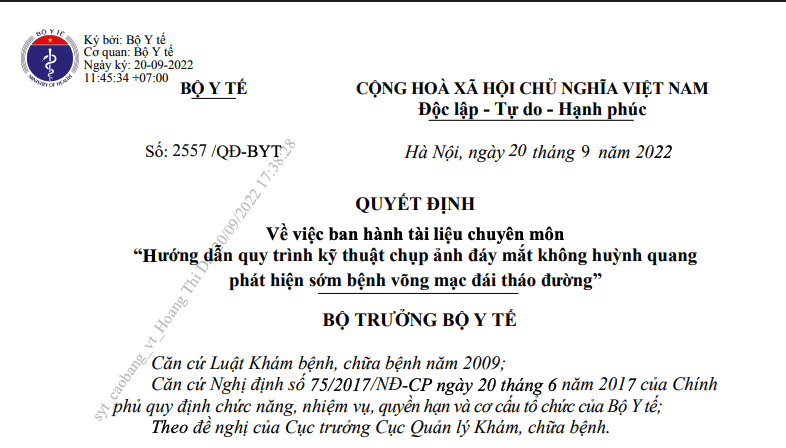 VỀ VIỆC BAN HÀNH TÀI LIỆU CHUYÊN MÔN “HƯỚNG DẪN QUY TRÌNH KỸ THUẬT CHỤP ẢNH ĐÁY MẮT KHÔNG HUỲNH QUANG PHÁT HIỆN SỚM BỆNH VÕNG MẠC ĐÁI THÁO ĐƯỜNG”