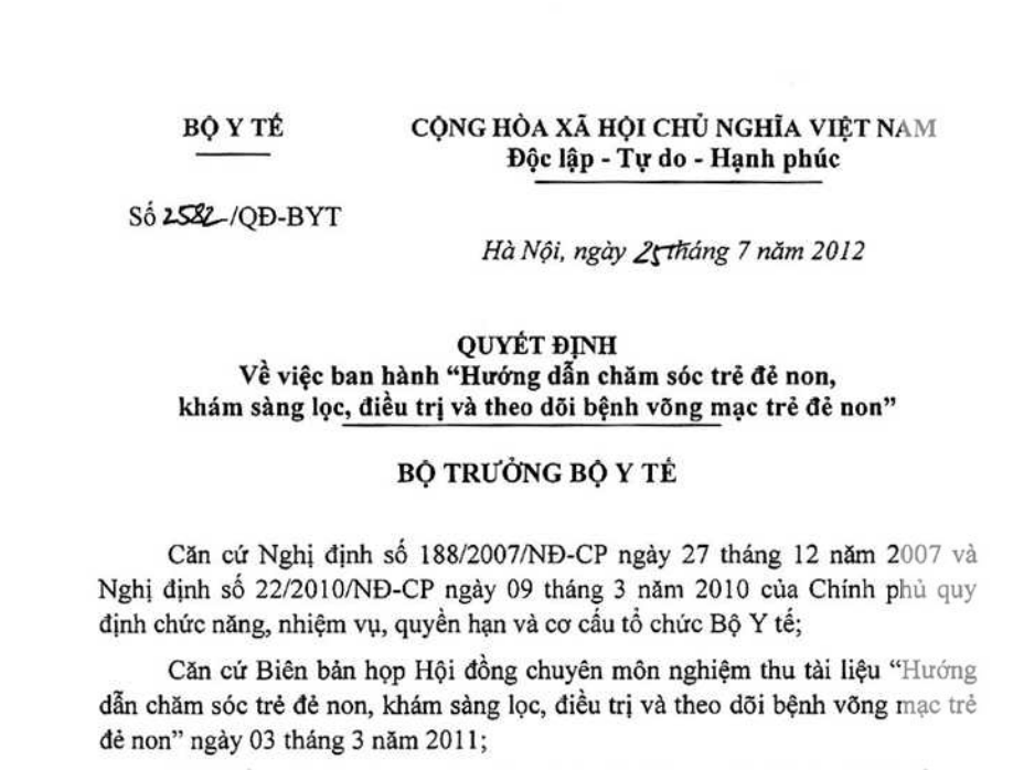 Căn cứ Biên bản họp Hội đồng chuyên môn nghiệm thu tài liệu “Hướng dẫn chăm sóc trẻ đẻ non, khám sàng lọc, điều trị và theo dõi bệnh võng mạc trẻ đẻ non” ngày 03 tháng 3 năm 2011;
