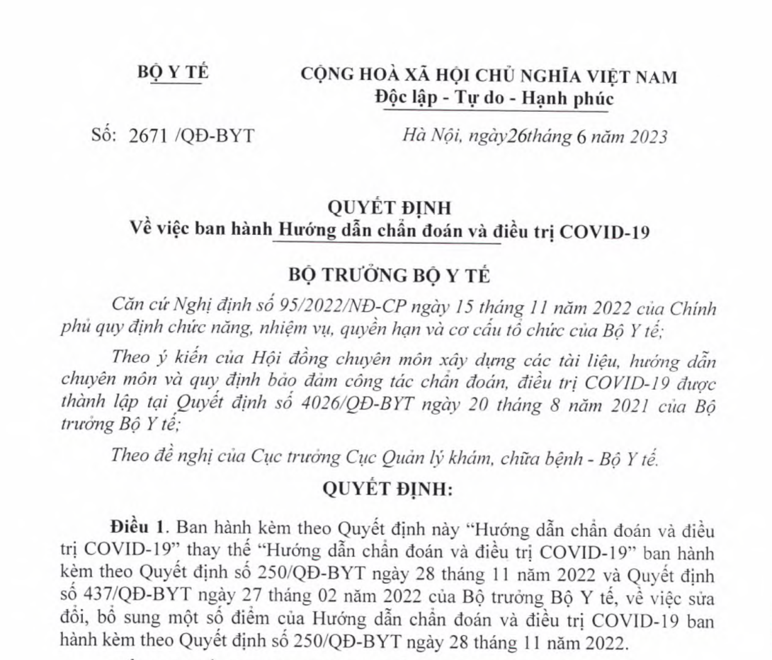 Quyết định 2671/QĐ-BYT ngày 26/06/2023 Hướng dẫn chẩn đoán và điều trị COVID-19 do Bộ trưởng Bộ Y tế ban hành