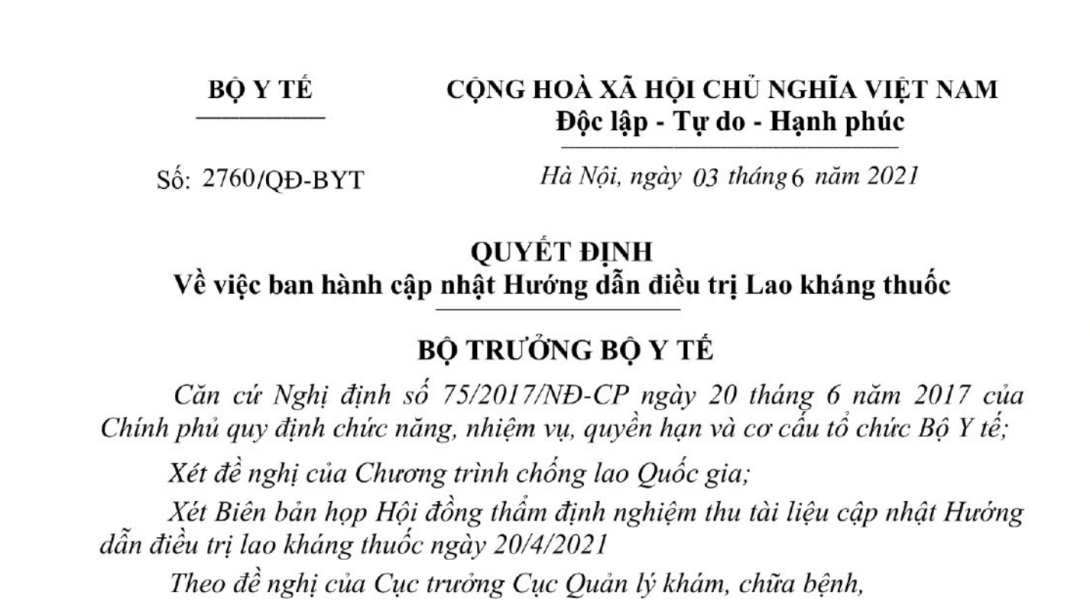 Điều 1. Ban hành kèm theo Quyết định này “Cập nhật hướng dẫn điều trị bệnh lao kháng thuốc” thay thế các nội dung liên quan đến nguyên tắc và hướng dẫn điều trị lao kháng thuốc của “Hướng dẫn chẩn đoán, điều trị và dự phòng bệnh lao” ban hành theo Quyết định số 1314/QĐ-BYT ngày 24/3/2020 của Bộ trưởng Bộ Y tế.