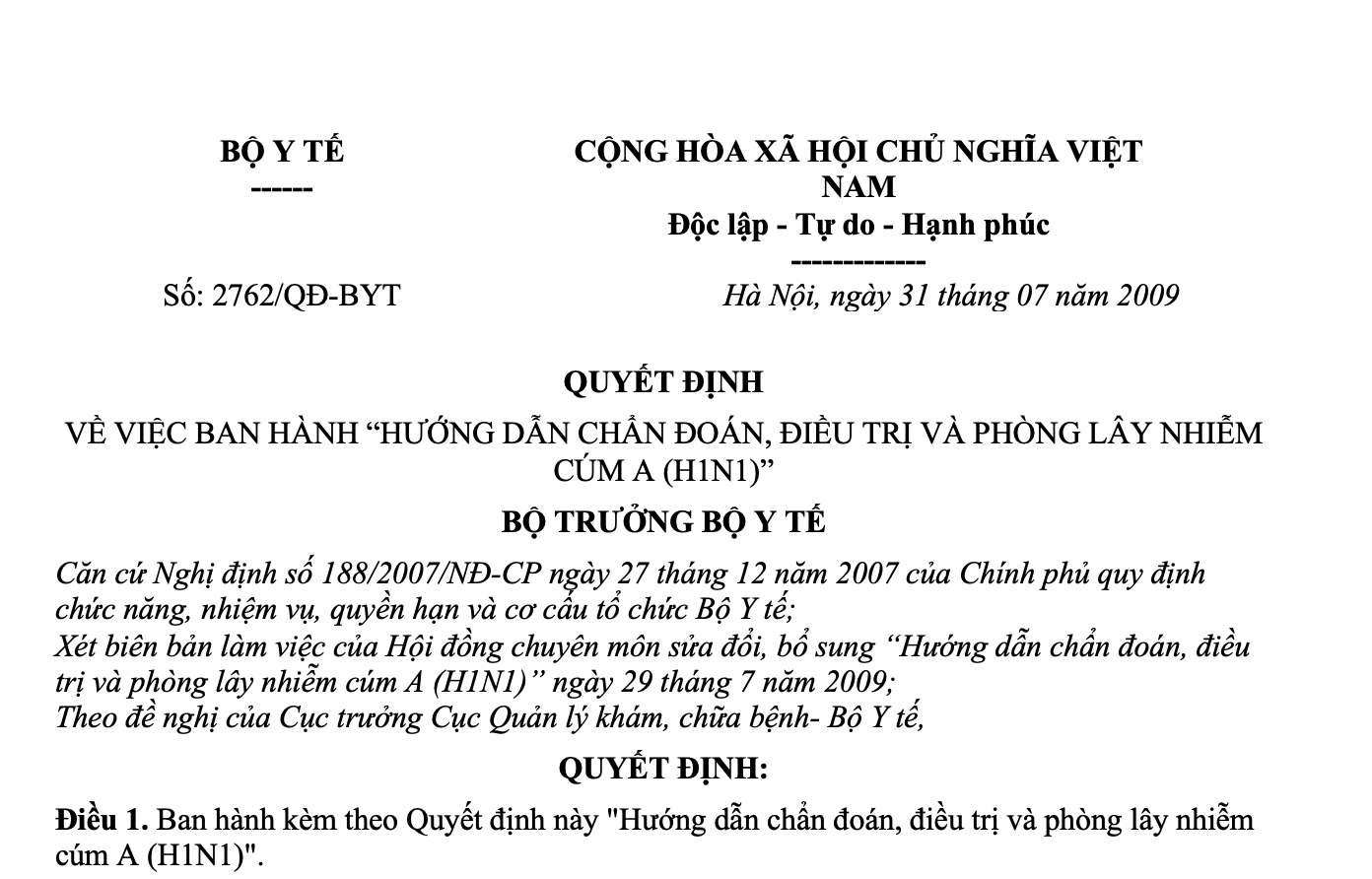 Điều 1. Ban hành kèm theo Quyết định này "Hướng dẫn chẩn đoán, điều trị và phòng lây nhiễm cúm A (H1N1)".