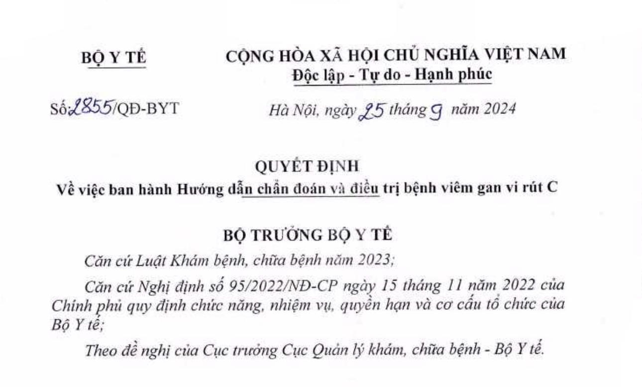 VỀ VIỆC BAN HÀNH HƯỚNG DẪN CHẨN ĐOÁN VÀ ĐIỀU TRỊ BỆNH VIÊM GAN VI RÚT C