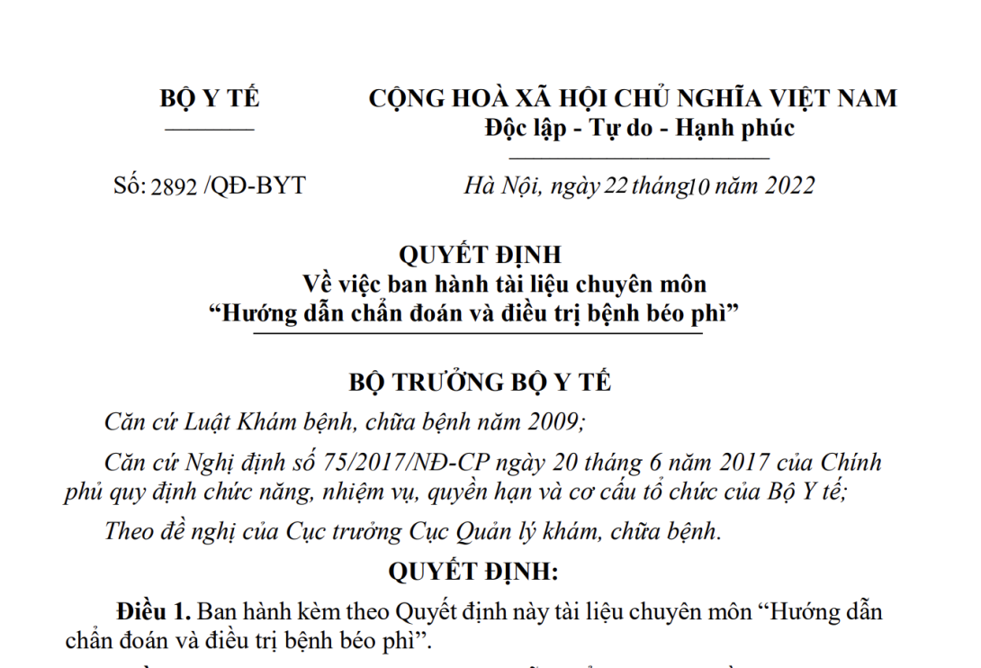 VỀ VIỆC BAN HÀNH TÀI LIỆU CHUYÊN MÔN “HƯỚNG DẪN CHẨN ĐOÁN VÀ ĐIỀU TRỊ BỆNH BÉO PHÌ”