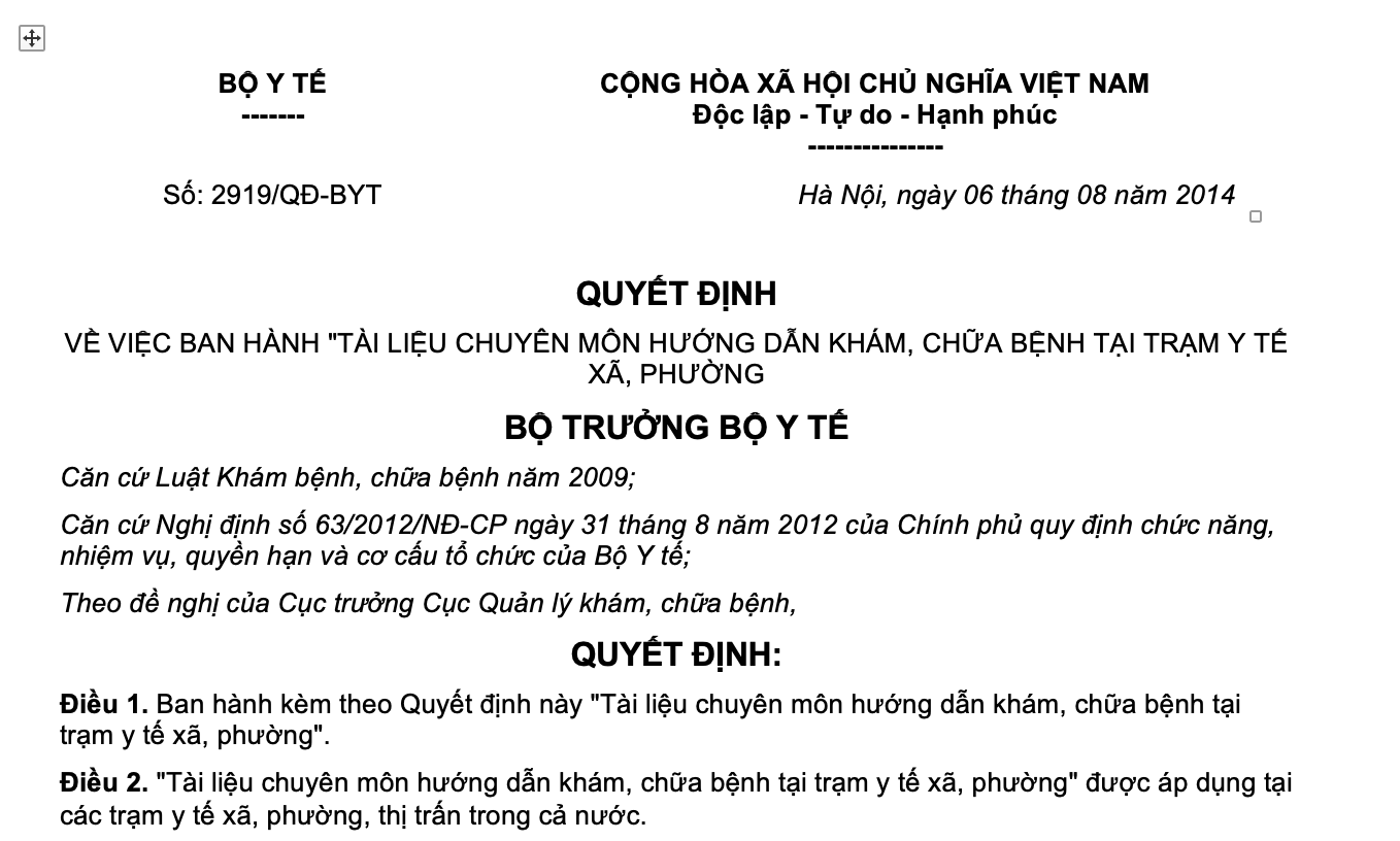 VỀ VIỆC BAN HÀNH "TÀI LIỆU CHUYÊN MÔN HƯỚNG DẪN KHÁM, CHỮA BỆNH TẠI TRẠM Y TẾ XÃ, PHƯỜNG
