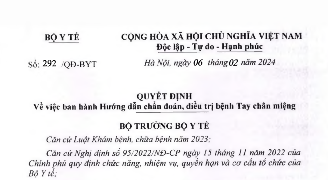 VỀ VIỆC BAN HÀNH HƯỚNG DẪN CHẨN ĐOÁN, ĐIỀU TRỊ BỆNH TAY CHÂN MIỆNG