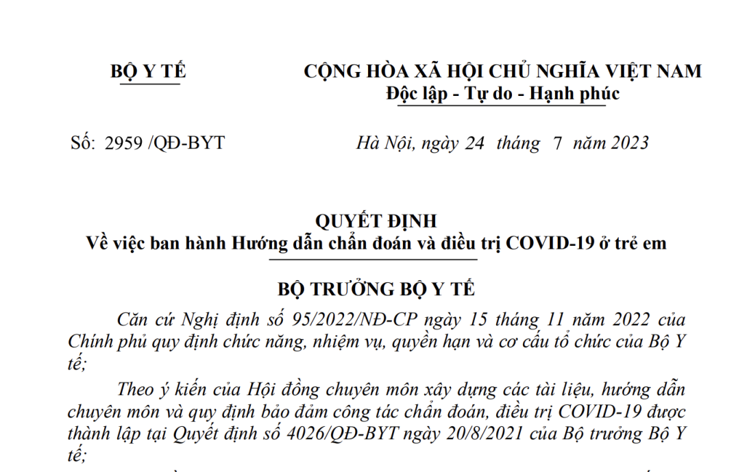 VỀ VIỆC BAN HÀNH HƯỚNG DẪN CHẨN ĐOÁN VÀ ĐIỀU TRỊ COVID-19 Ở TRẺ EM