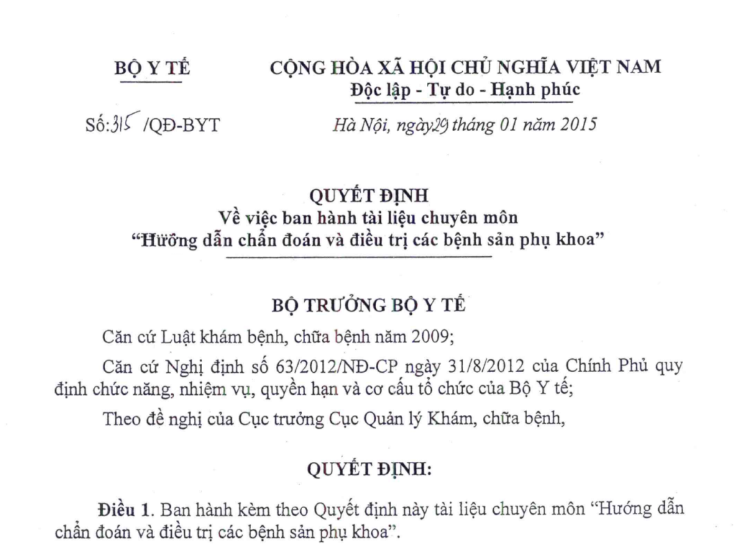 VỀ VIỆC BAN HÀNH TÀI LIỆU CHUYÊN MÔN “HƯỚNG DẪN CHẨN ĐOÁN VÀ ĐIỀU TRỊ CÁC BỆNH SẢN PHỤ KHOA”
