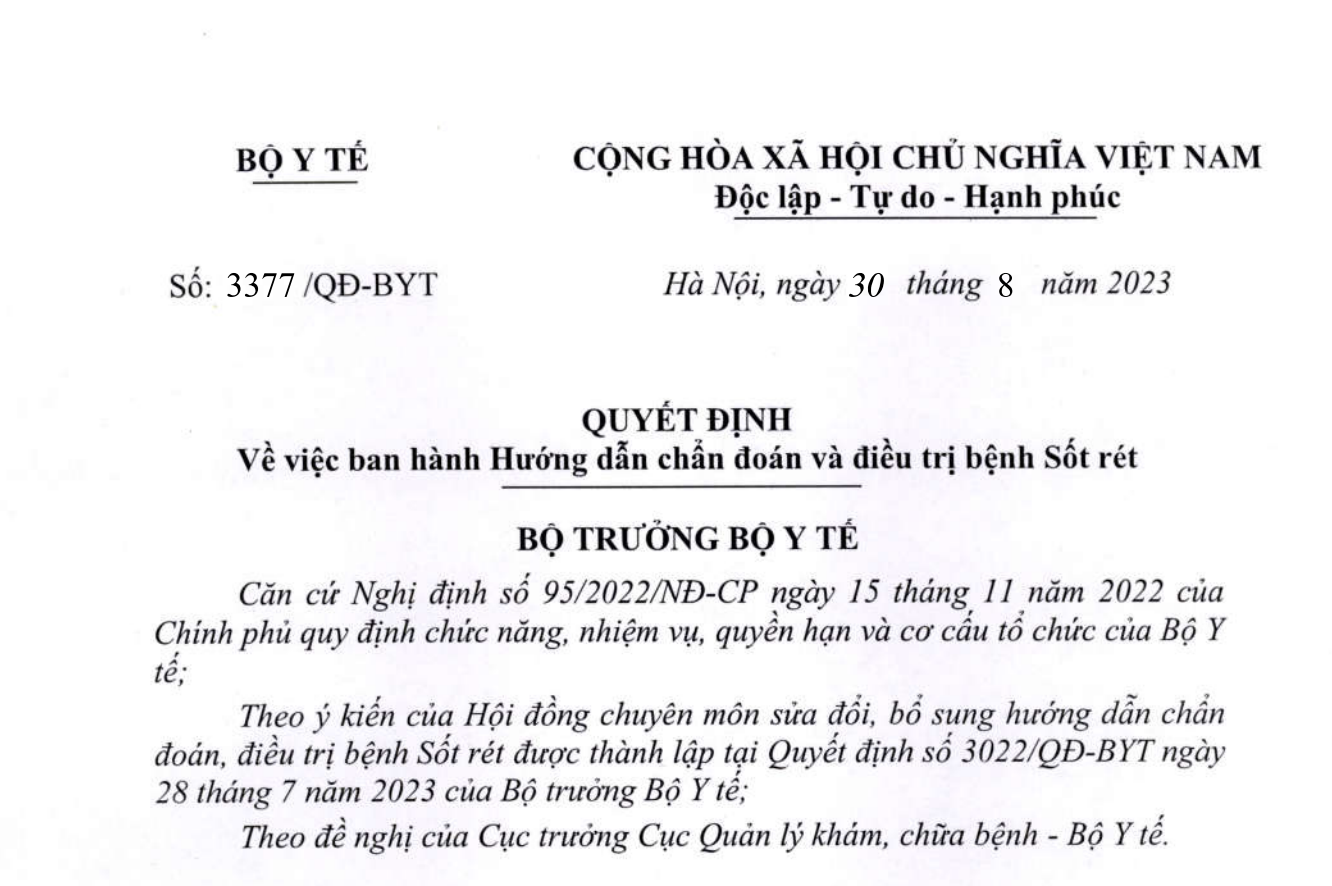 Quyết định 3377/QĐ-BYT ngày 30/08/2023 về Hướng dẫn chẩn đoán và điều trị bệnh Sốt rét do Bộ trưởng Bộ Y tế ban hành