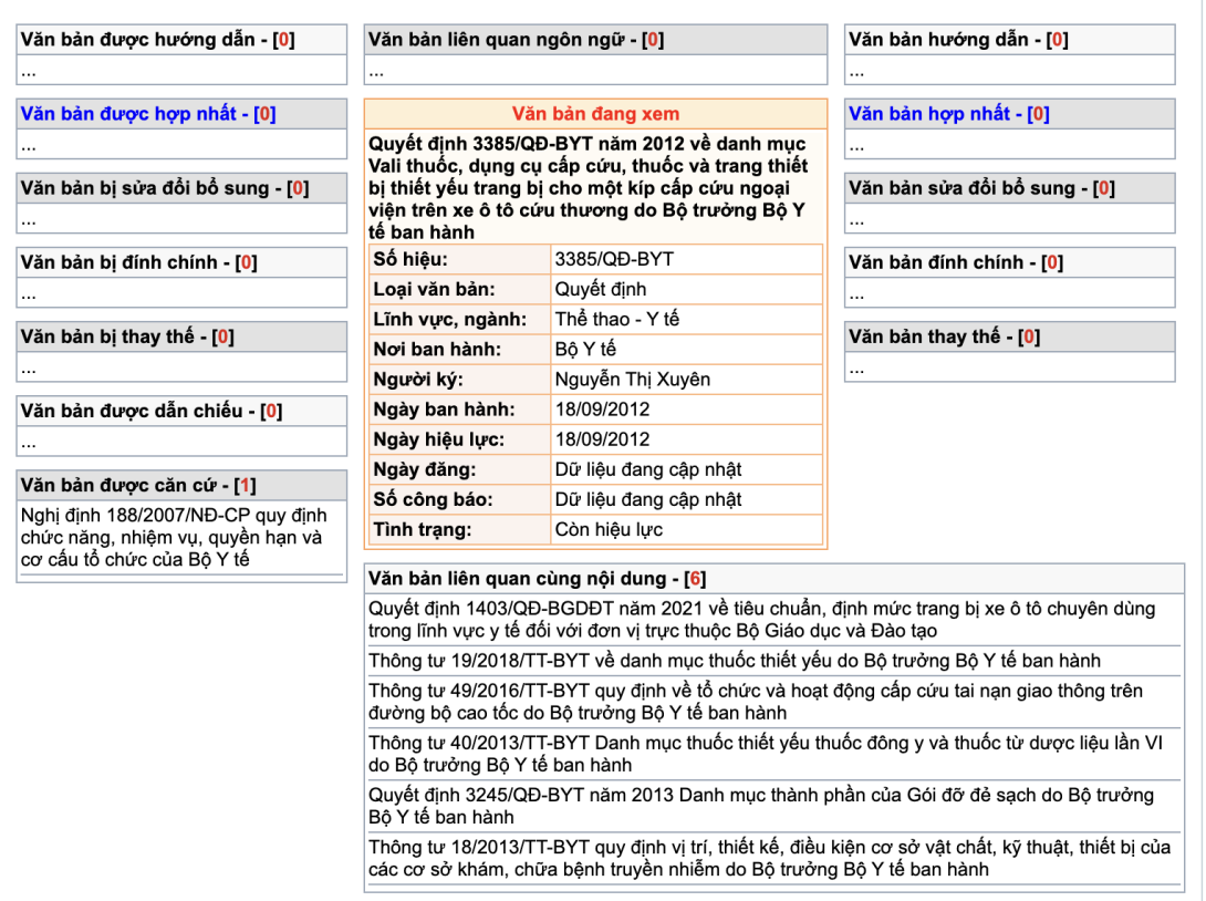 Quyết định 3385/QĐ-BYT năm 2012 về danh mục Vali thuốc, dụng cụ cấp cứu, thuốc và trang thiết bị thiết yếu trang bị cho một kíp cấp cứu ngoại viện trên xe ô tô cứu thương do Bộ trưởng Bộ Y tế ban hành