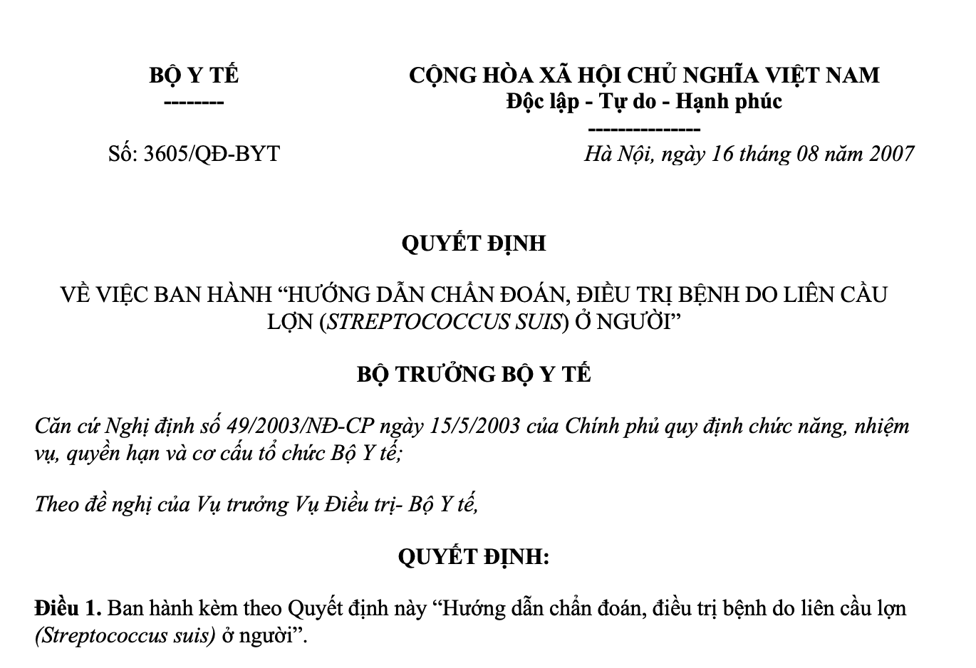 VỀ VIỆC BAN HÀNH “HƯỚNG DẪN CHẨN ĐOÁN, ĐIỀU TRỊ BỆNH DO LIÊN CẦU LỢN (STREPTOCOCCUS SUIS) Ở NGƯỜI”