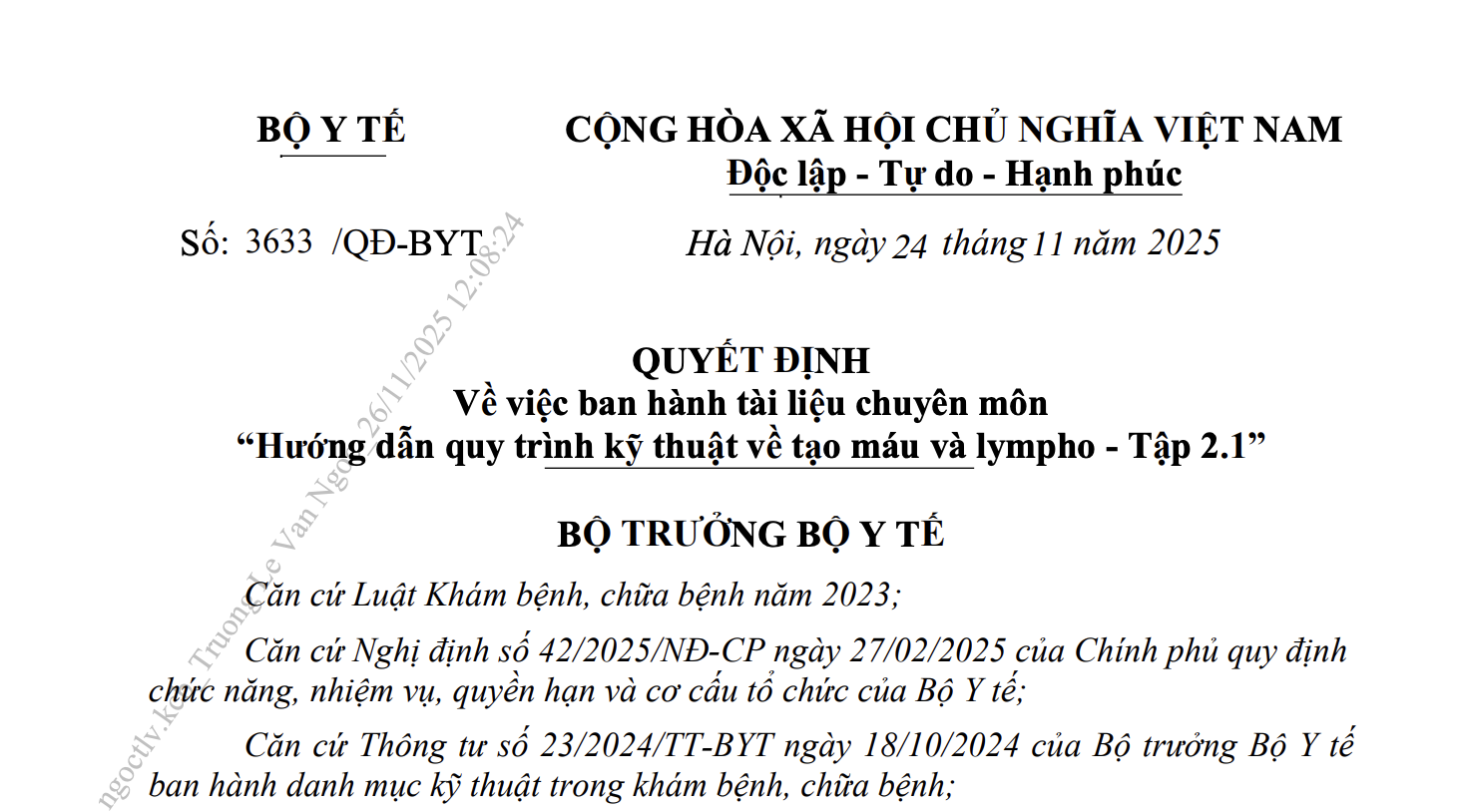 Căn cứ Biên bản họp ngày 13/3/2024; 24/4/2024; 12/6/2025 của Hội đồng chuyên môn nghiệm thu quy trình kỹ thuật chương Tạo máu và lympho (hệ nội) và công văn số 1608/HHTM ngày 10/11/2025 của Viện Huyết học – Truyền máu Trung ương gửi dự thảo quy trình kỹ thuật chương Tạo máu và lympho;