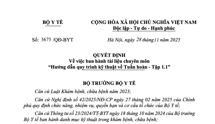 Căn cứ Biên bản họp ngày 14 tháng 07 năm 2025 của Hội đồng chuyên môn nghiệm thu quy trình kỹ thuật về Tuần hoàn (hệ nội) và Công văn số 5543/BM-KHTH ngày 20 tháng 8 năm 2025 của Bệnh viện Bạch Mai về việc gửi dự thảo hướng dẫn quy trình kỹ thuật về Tuần hoàn (hệ nội) đã được Chủ tịch Hội đồng chuyên môn nghiệm thu duyệt dự thảo;