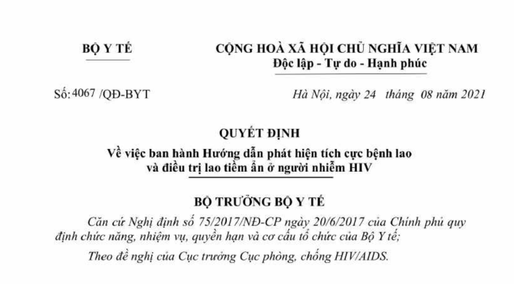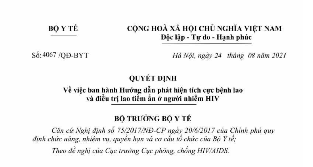 Quyết định 4067/QĐ-BYT ngày 24/08/2021 về Hướng dẫn phát hiện tích cực bệnh lao và điều trị lao tiềm ẩn ở người nhiễm HIV do Bộ trưởng Bộ Y tế ban hành
