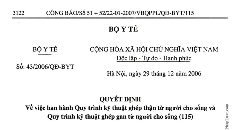 VỀ VIỆC BAN HÀNH QUY TRÌNH KỸ THUẬT GHÉP THẬN TỪ NGƯỜI CHO SỐNG VÀ QUY TRÌNH KỸ THUẬT GHÉP GAN TỪ NGƯỜI CHO SỐNG