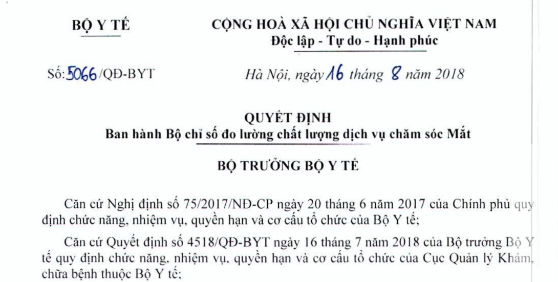 Quyết định 5066/QĐ-BYT năm 2018 về Bộ chỉ số đo lường chất lượng dịch vụ chăm sóc Mắt do Bộ trưởng Bộ Y tế ban hành