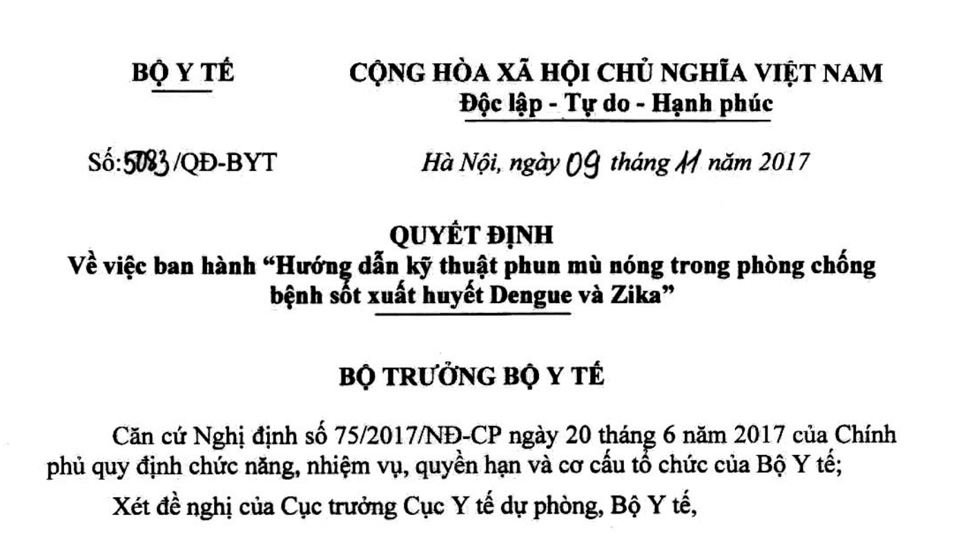 Quyết định 5083/QĐ-BYT năm 2017 về Hướng dẫn kỹ thuật phun mù nóng trong phòng chống bệnh sốt xuất huyết Dengue và Zika do Bộ trưởng Bộ Y tế ban hành
