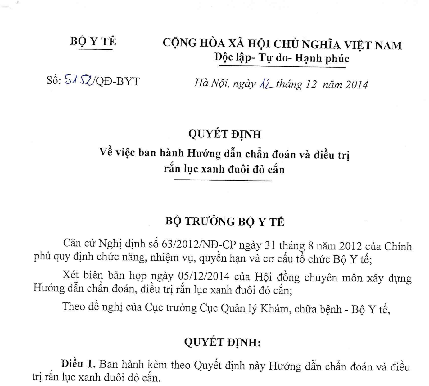 Xét biên bản họp ngày 05/12/2014 của Hội đồng chuyên môn xây dựng Hướng dẫn chẩn đoán, điều trị rắn lục xanh đuôi đỏ cắn;