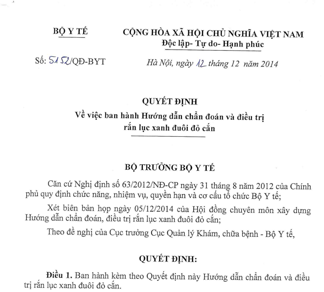 VỀ VIỆC BAN HÀNH HƯỚNG DẪN CHẨN ĐOÁN VÀ ĐIỀU TRỊ RẮN LỤC XANH ĐUÔI ĐỎ CẮN
