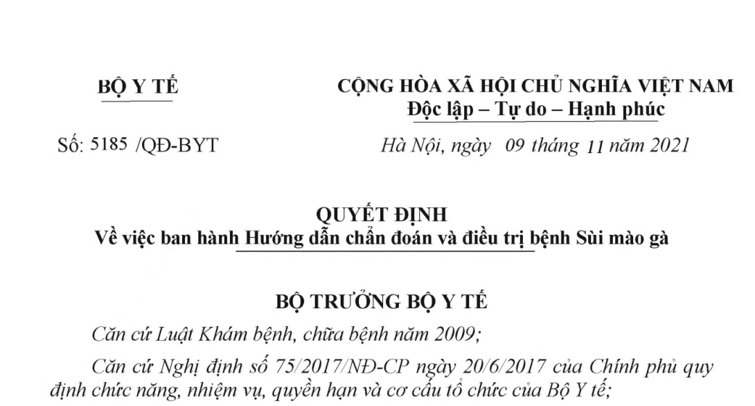 Quyết định 5185/QĐ-BYT năm 2021 hướng dẫn chẩn đoán và điều trị bệnh Sùi mào gà do Bộ trưởng Bộ Y tế ban hành